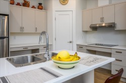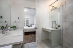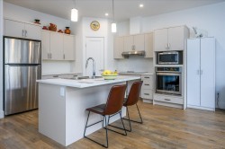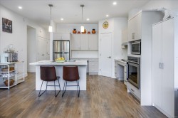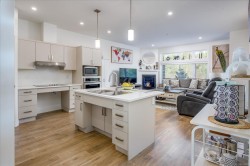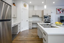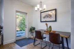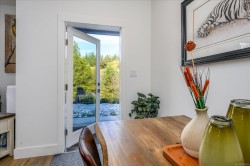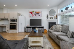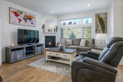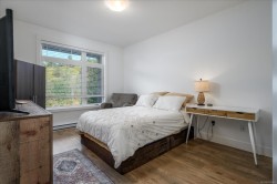 Welcome to this modern townhouse in Linley Valley offering convenient one-level living with 2 spacious bedrooms, 1 den, and 2 full bathrooms. This home features an open-concept layout with a contemporary kitchen and high-end finishes. The living space leads to a private rear patio with peaceful mountain and pond views - an ideal spot to relax and enjoy nature at your doorstep (literally)! Enjoy year-round comfort with a new heat pump, gas fireplace, ensuite in-floor heating, and an on-demand gas hot water heater, offering energy efficiency and a cozy living environment. Additionally, a single-car garage provides convenient, secure parking and extra storage space. Located at the end of a quiet road, this home is directly across from the Linley Valley/Cottle Lake Main Trail Head. With modern design, premium features, and a garage, this home offers an exceptional lifestyle in a serene location!