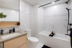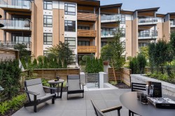 NEW PRICING & MOVE-IN READY! Welcome to Timber House by Aragon. This spacious 2 bed/1 bath ground floor home offers 940 SF of interior living space and approx 764 SF PRIVATE PATIO. Modern, high-design interiors feature exposed CLT panels, wide-plank oak floors, black roller blinds & A/C. The sleek kitchen offers full size Fisher Paykel + Smeg appliances, quartz counters, matte black hardware. Spa-inspired baths feature heated floors, floating vanities & frameless glass showers. Building amenities include: Courtyard, gym, BBQ area, dog wash, 1 parking (EV-ready opt), 1 storage. Steps to the boardwalk, 12 min to DT New West, 30 min to YVR, 35 min to DT Van. Photos shown may be from a display suite – not the actual unit. OPEN HOUSE EVERY SAT TO MON 1–4PM OR BY APPT.