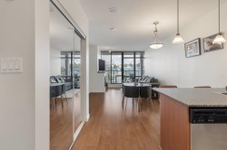 Opportunity knocks at “The Point”, located in the vibrant Downtown New West! Welcome to this spacious 1 bed + den unit, featuring an ideal open concept layout, perfect for first-time buyers or savvy investors. Features include an open kitchen with granite counters, stainless steel appliances, a breakfast bar, and modern cabinetry. Relax in the deep soaker tub, laminate floors, in-suite laundry, one parking spot, and ample street parking. Building amenities include an indoor pool, hot tub, gym, media room, and lounge area. All this just steps from the SkyTrain, shops, restaurants, Pier Park, and the Quay. A smart start in a prime location!
