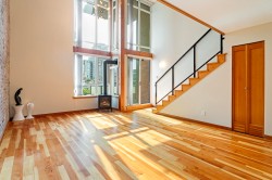 Experience urban living at its finest in this spacious and stylish 2-level loft, inspired by the iconic design of New York’s Soho district. One of the largest one-bedroom layouts in the building, this home offers a perfect blend of openness, character, and functionality. Dramatic 17-foot ceilings and expansive windows flood the space with natural light, while the exposed brick wall adds an authentic loft feel. The open main level includes a modern kitchen with granite counters and stainless steel appliances, plus a gas fireplace for added warmth and charm. Upstairs, the loft bedroom overlooks the living space and features a walk-in closet and in-suite laundry with updated washer and dryer. Freshly painted and move-in ready, this home includes 1 secure parking stall and a storage locker.