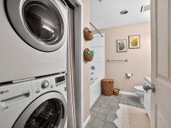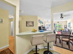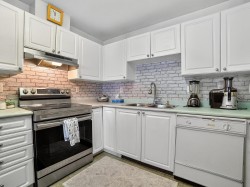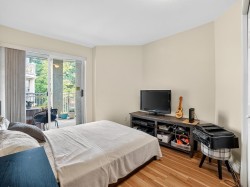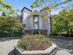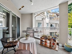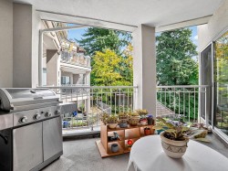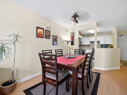 Welcome to Kingsgate Court in uptown New West. This inside corner unit opens up to laminate wood floors in the foyer, running to the dining room and living room with a gas fireplace and sliding glass doors that step out to the covered balcony, accessed as well from both bedrooms. The open kitchen has a breakfast bar opposite the stainless steel appliances and double sink. In suite storage sits adjacent to the hall closet. The three-piece main bathroom sits across the hall from the second bedroom. The primary bedroom, enjoying the same green belt, courtyard views from the deck and living room, has double mirrored closets on the way to the en suite and stacked washer and dryer. 2 cats/dogs allowed.