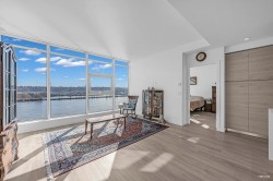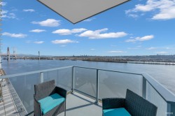 Set in the heart of New Westminster’s lively waterfront community, this exceptional corner residence captures panoramic mountain scenery, sparkling city views, and uninterrupted vistas of the Fraser River. The bright two-bedroom plus den/flex layout is wrapped in floor-to-ceiling windows, filling the home with natural light. An expansive open-concept living and dining space creates the perfect setting for hosting, while the gourmet kitchen is outfitted with premium Bosch appliances, contemporary cabinetry, generous storage, and a spacious island with seating. Experience Pier West living just moments from shops, restaurants, picturesque riverfront paths, and the SkyTrain, complemented by resort-inspired amenities such as 24-hour concierge service, a fully equipped fitness centre and sauna.