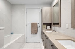 VALUE, FUNCTION, and LOCATION in one smart package! This bright 2 Bed + Den, 2 Bath corner home offers a highly efficient layout with excellent bedroom separation ideal for professionals, first-time buyers, and investors alike. A home chef's dream kitchen w/ 5-burner gas cooktop, deluxe integrated appliances, double dishwasher, and oversize kitchen island perfect for entertaining. You will love the luxury 5-piece spa-like ensuite. Stay comfortable all year with radiant heat & AC with sustainability & design at the forefront of this certified LEED Platinum building. Step outside your front door and find yourself in Moodyville Park and a short walk along the Spirit Trail to LoLo's dining, shopping, and transit options. 2 pets ok. Bonus 2 XL parking included! Open House Saturday Feb 28 2-4.
