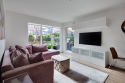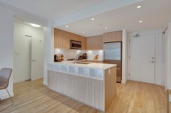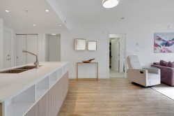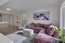 Step into this exceptional south facing 3-bedroom, 2-bathroom with XL 421sf south-facing patio! 3rd bedroom is a den and can be used as bedroom. The open-concept design seamlessly connects the kitchen, living and dining areas that are flooded with natural light from floor-to-ceiling windows. The gourmet kitchen features quartz countertops, inviting island bar, and top-of-the-line Fisher Paykel appliances. Outside, the sprawling sun soaked deck offers plenty of space for dining and relaxing. Located in a vibrant neighbourhood, just steps away from shops, transit, cafes, and scenic trails. In-suite laundry and 1 parking space, this pet-friendly home offers an unparalleled opportunity for luxurious urban living. OPEN HOUSE Sat Feb 28 2-4pm