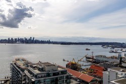 Welcome to Esplanade at the Pier 1 of lower Lonsdale's most sought after waterfront addresses. This concrete two bedroom two bathroom condo offers 952 ft.² of smart functional living with a great layout & incredible north west facing views of the mountains, ocean & city skyline. Enjoy the comfort of 9 foot ceilings in central air conditioning with gas & AC included in the strata fees. The Open concept living space is flooded with natural light through floor-to-ceiling windows. While the kitchen features granite countertops stainless steel appliances. Just steps to the Seabus, Lonsdale Quay, Shipyards District, shop and restaurants. Hotel-style amenities for a fee: pool, gym,hot tub & more. Pets & rentals welcomed. Includes 1 parking & 1 storage. SHOWINGS BY APPT FEB 14 & FEB 15 AT 2:00 P.M