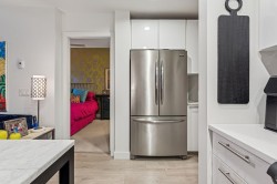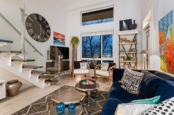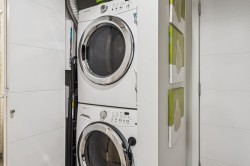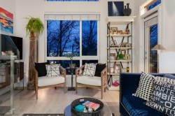 Perched on the top floor of The Shore by Adera, this South-West-facing one bedroom + den is filled with light, vaulted ceilings, and beautiful city, water, and mountain views. Outdoor living is a true highlight, with a private rooftop patio and an oversized main-floor balcony overlooking Mosquito Creek. Surrounded by greenery, the setting feels calm and restorative, with birdsong and the occasional eagle adding to the natural backdrop. Inside, the home offers a sleek yet inviting modern interior with white cabinetry, stainless steel appliances, and a thoughtfully designed, highly functional floor plan. This LEED-certified, pet-friendly building includes a yoga room, fitness centre, and meeting space, all just steps from the SeaBus, waterfront trails, cafés, restaurants, and the ocean.