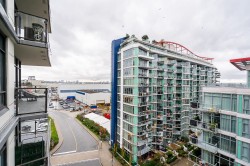 Welcome to The ATRIUM built by Pinnacle, this beautiful OCEANSIDE 2 bedroom/2 bathroom condo located on the 9th floor offers views of the water and city. Elegant open plan spacious living/dining area with stunning flooring, crown moulding and fireplace. The bedrooms are nicely separated each with en-suite. Kitchen offers granite counters, SS appliances & a gas range. There's a den for a home office and large walk-in closet. Enjoy central A/C on those hot days or lounge on the SOUTH facing deck. This move-in ready home comes with 2 PARKING SPOTS & a locker. Exclusive access to the Pinnacle amenities, incl. a pool, steam room, hot tub, sauna and gym. Walking distance to the Seabus, Lonsdale Quay, steps to the Shipyard markets, restaurants & coffee shops. Excellent floorplan.