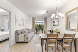 Welcome to Cedar Downs, one of Pitt Meadows' most sought-after condo communities! This beautiful 2 bedroom + den unit impresses from the moment you walk in, featuring a bright open concept layout with 9 ft ceilings and expansive windows that fill the space with natural light. Both bedrooms are spacious primaries with walk-in closets and spa-inspired ensuites complete with heated floors, fog-free mirrors, and a soaker tub/shower combo. Enjoy a cozy covered patio perfect for morning coffee or evening BBQ's, built-in A/C in both bedrooms, two parking stalls, and a huge 10x10 roll-up storage locker right next to your parking spot. Steps to the West Coast Express, shops, restaurants, schools and trails, come enjoy the best of Pitt Meadows living! OPEN HOUSE SAT NOV 15 12PM-2PM