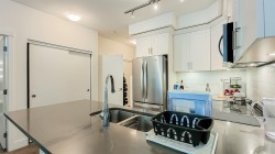 Welcome to LUMIERE, a NEWER DEVELOPMENT in the heart of Downtown Port Coquitlam!! Well laid out open concept 1 bedroom & den & 1 bathroom GROUND LEVEL unit!! Kitchen has quartz countertops, breakfast bar, stainless steel appliances & white shaker cabinetry w/under mounted lighting. Beautiful 12mm laminate flooring throughout with TJI silent floor system. 9' ceilings throughout for an open & airy feeling. Roughed In Central Vacuum, Smart Thermostat. Large 96sf covered PATIO for your entertaining. Close to transit, schools & Westcoast Express with Gates Park just a block away!! Walk to the new PoCo Recreation Centre!! Pet & rental friendly building. 2 Recreation Rooms for entertaining!! Wheelchair friendly. 1 parking stall included w/several bike rooms. 4 EV Charging Stations in building!!