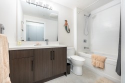 Enjoy nature & community at Sophia Living, located in Historic Port Moody Centre. Walk to Rocky Point Park, sky train & west coast express. Stroll the Burrard Inlet Shoreline Trail, visit the brewery district, local shops & eateries. A vibrant community. Two bed & den, garden flat townhome with 2 full bathrooms. Chefs are sure to love the large open kitchen with island, premium stainless appliance package & engineered quartz counter tops. Pendant & cabinet undermount lighting. Fabulous, private outdoor area off kitchen perfect for barbequing, with southern exposure, facing away from busy Murray street. Corner unit, still covered by new home warranty. 2 Parking stalls & 1 locker, allocated to unit. Wheelchair accessible home. A1 Plan, in the dusk colour scheme. Open Sun Jan 25th 1-3pm.