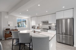 Perched high above Squamish, this bright and nearly new 3bed/3bath townhome by Polygon offers modern design in a prime Garibaldi Springs location. The open-concept main level features a sleek kitchen with stone countertops, s/s appliances, and a large island with bar seating, plus a dedicated office nook and powder room. Upstairs includes 3 bedrooms, highlighted by a spacious primary suite with walk-in closet and spa-inspired ensuite. Enjoy a private patio, fenced yard (2 dogs allowed), epic mountain views, oversized side-by-side double garage, and direct trail access from your doorstep. Positioned in a lower-density enclave with approximately half the density of the newest Terrain release, this home offers more space, privacy, and breathing room. GST paid and ready for quick possession.