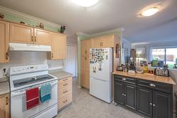 Spacious well-appointed ground floor corner unit located in beautiful Summerland. This 2 bedroom, 2 bathroom features an open concept living area with a corner fireplace, large bedrooms, spacious laundry room and great storage. Upgrades include crown molding in the living and kitchen areas, new refrigerator, refinished counters, neutral paint colors and new flooring in the bedrooms. Access the private patio and beautiful green space through the sliding doors in the living room. Only steps to the covered parking stall and the spacious 9x6 storage locker, no elevator needed. This property is move in ready, all appliances are included. Currently this complex has no age restriction, and allows rentals and pets. Call to book your private viewing today.