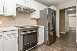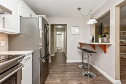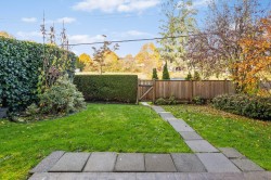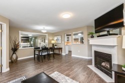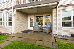 Derby Downs. Large 1 bedroom & den condo with street access from living room which opens onto a large fenced yard with a gate. Your own backyard with lots of street parking right in front, on the very quiet street. Quiet space across the street. Mostly updated with newer flooring, large kitchen, Ceasar counter tops, s/s appliances, lighting cabinets, sinks faucets, hood fan and more. Laundry has a barn door. Great building with rain screening completed in 2011 and new roof in 2019. 1 storage locker, car wash station, gym and workshop for your projects. Strata fees include hot water and gas fireplace. Pets allowed w. restrictions. Immediate possession possible.