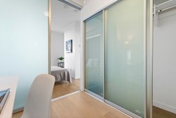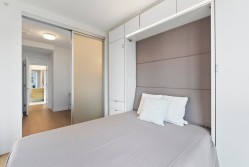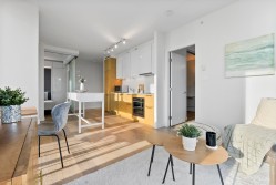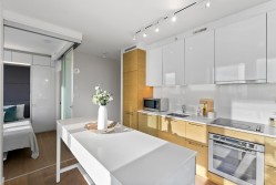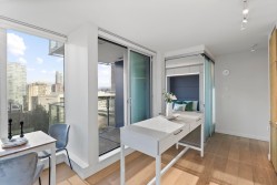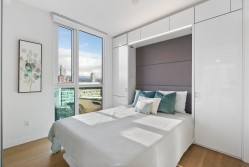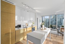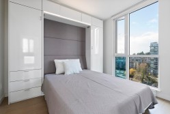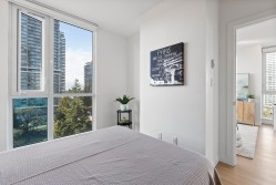 Soak in sweeping 180° unobstructed views from this modern 2-bed + den corner home in the heart of Surrey City Centre. Smart design shines throughout—both bedrooms feature custom Murphy beds to maximize space, while the den includes its own closet, making it a true third-room option. Large windows flood the 750 sq.ft. layout with natural light, creating an airy, elevated feel. Just six years young, this home offers easy access to Holland Park, Surrey Central SkyTrain, Central City’s shops and services. A vibrant, walkable lifestyle with everything at your doorstep.