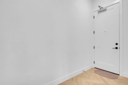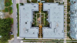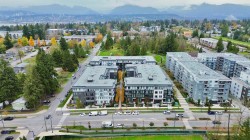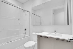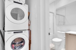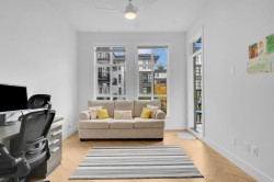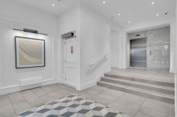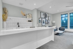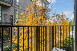 Beautifully bright and spacious one-bedroom corner home offering approximately 625 sq. ft. of well-designed living space, enhanced by an oversized wraparound balcony with peaceful courtyard views. This standout suite features soaring ceilings, elegant herringbone flooring, and an open-concept layout with upgraded composite stone countertops, stainless steel appliances, and in-suite laundry. Floor-to-ceiling windows flood the living area with natural light, while quality window coverings ensure comfort and privacy. Two secured parking stalls included. Situated just steps from parks, schools, shops, and everyday conveniences.