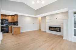 Stunning upper corner unit has it all — space, style, and comfort. With vaulted ceilings, new appliances, and modern blinds this beautifully updated 2-bed, 2-bath home offers elegance in every detail. Natural light pours through large window enhancing the open-concept living space while the cozy fireplace adds warmth and charm. Spacious primary suite features an en-suite bathroom and a generous walk-in closet. Second bedroom is ideal for guests, family, or a home office. Large private deck with a partially covered patio, complete with a sitting area and garden — perfect for relaxing, dining, or enjoying fresh air year-round. Centrally located, close to shops, restaurants, parks, and offers quick highway access. Move-in ready, combines convenience, modern upgrades, and a peaceful lifestyle.