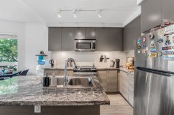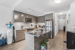 Welcome to Waterstone – premier resort-inspired community on the border of Surrey/Langley. This spacious 2 bedroom, 2 bathroom CORNER UNIT offers designer living with a gourmet kitchen featuring granite countertops, lots of natural light, and rich laminate flooring. The open layout is highlighted by soaring 9’ ceilings, oversized windows, upgraded in-suite laundry, and a private sunny balcony perfect for relaxing or entertaining. Added value includes 2 underground parking stalls and 2 large storage lockers. Waterstone is known for its 15,000 sq. ft. Clubhouse & Wellness Centre—offering a fireside lounge with demo kitchen & wine bar, private 17-seat movie theatre, billiards room, state-of-the-art fitness facilities, yoga studio, indoor lap pool, sauna, and hot tub. Don't miss this one!
