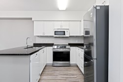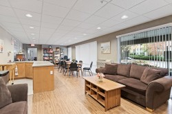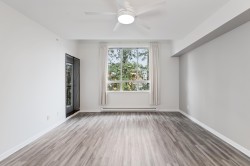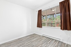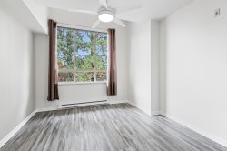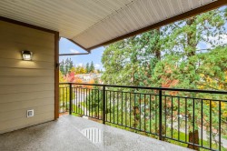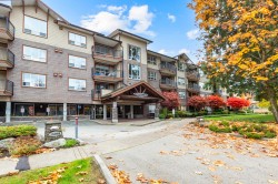 Stunning, renovated Top Floor home in Fleetwood Gardens a 55+ centrally located building.2 bedroom + den, with 2 full bathrooms, in-suite laundry, secure parking for 1 vehicle, boasting over 1000 sqft of functional living space. Natural light fills this North facing home with 9 foot ceilings and large windows overlooking trees for a picturesque setting. Home in immaculate condition with recent upgrades including vinyl plank floor, lighting, kitchen/bathroom cupboards, quartz counter tops, newer appliances including induction stove! Large primary bedroom with his & hers closet and ensuite with tub. Relax & enjoy mountain views from your large covered patio. Just minutes walk from Fleetwood Community Centre, parks, grocery stores, restaurants, and transit. Quick Possession possible!