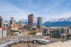17th Floor with Sweeping Views! Perched on the 17th floor of Europa, this updated bachelor home offers panoramic city, water & mountain views. Bright & functional with new vinyl plank floors, fresh paint, modern lighting, updated bathroom, and full kitchen with gas range & appliances. Clever hydraulic storage bed included. Building amenities: A/C, in-suite laundry, indoor pool, hot tub, sauna, gym & bike storage. Steps to Chinatown, Gastown & local parks. Parking and Storage included!