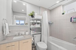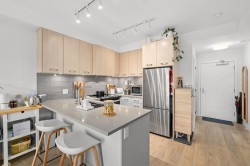CLARENDON HEIGHTS – Bright 3 bed, 2 bath + flex corner home with stunning North Shore mountain & city views! Scandinavian-inspired kitchen features quartz counters with lots of space, double sink & full-size SS appliances. Open living/dining flows to a north-facing balcony perfect for relaxing or entertaining. All 3 bedrooms enjoy natural light & lots of privacy. Bonus flex space can be used as a Den or extra storage along with 2 storage lockers & 1 parking included. Building offers rooftop patio space, playground & amazing views. This home is move in ready and meticulously cared for like brand new all without the GST!