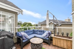 Urban charm meets river views! This stylishly updated 2 bedroom, 2 bathroom, 1263 square foot home impresses with tons of updates throughout. The modern industrial kitchen features updated cabinets with loads of storage space & butcher block counters including breakfast bar -- perfect for entertaining. The light coloured oak laminate flows throughout the spacious living & dining areas with a cozy gas fireplace. Enjoy BBQs or sunsets on your oversized deck with sweeping Fraser River views. The massive top-floor primary retreat boasts a 3pc ensuite, walk-in closet & attic storage. A 2nd bedroom & 4pc bathroom complete the main. Includes 2 parking stalls & easy access to River District shops & trails. Don't miss this gem!