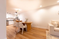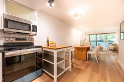Tucked away west of Denman, this spacious 2-bedroom home offers rare privacy and walkability. Both bedrooms open onto a unique patio framed by mature trees. A 2nd patio extends off the main living area - ideal for summer dinners or year-round barbecues. Extensively renovated and move-in ready, this home features updated flooring, paint, light fixtures, kitchen appliances and bath finishes. Bright in summer, cozy in winter, and steps from English Bay, Stanley Park, and Denman Street’s shops, cafés, and groceries. Includes 1 parking space and a storage locker. A relaxed, well-kept building with a professional and friendly vibe—an inviting retreat in the heart of the West End.