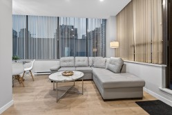 Bright corner 1-bedroom home featuring over-height ceilings and wall-to-wall windows that fill the space with natural light. Recently updated with new flooring throughout and offered fully furnished for a true turn-key opportunity. Efficient layout makes the home feel open and spacious year-round. Located in Downtown Vancouver’s Fortune House, steps to Robson & Alberni shopping, Yaletown dining, and SkyTrain access. Well-maintained building in a prime central location. No rental restrictions and Airbnb allowed—a rare find - where you can live and earn. Ideal first home, pied-à-terre, or investment property. Open House: Saturday, February 14 from 1-3pm