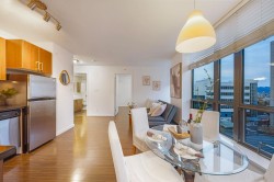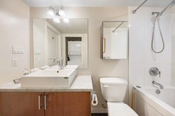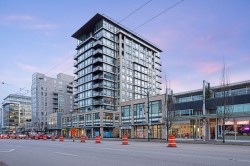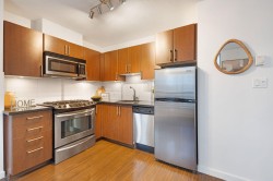 Discover the charm of this bright 1 bedroom plus Den & solarium residence at The Zone, nestled in the southeast corner for optimal tranquility. This immaculate concrete unit boasts a superb layout with granite countertops, a sleek GAS range, rich laminate flooring, an undermount sink, stainless steel appliances, and expansive floor-to-ceiling windows. Enjoy the convenience of rental and pet-friendly policies, along with secure underground parking, a dedicated storage locker, and bicycle storage.