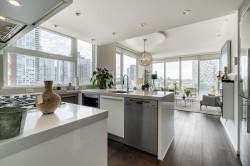 New price! The Ideal Executive home in the Beach District. Perfect for 1st time home buyers, downsizers, investors or anyone who loves a stylish space to work from home. Step into the formal foyer where an inviting layout unfolds; 2 separated bedrooms, 2 bathrms + Den/Office + large Pantry. This bright corner suite features gorgeous engineered hardwood floors, newer Miele/Bosch appliances, custom kitchen finishes, gas cooktop, built in entertainment center, & California closets. Enjoy the prestige of 24-hour concierge services, the exercise center, sauna, party room & playground for the kiddies. BONUS-AC/heat pump! The Maddox, built by Cressey is an efficient, well managed building, just a hop, skip & a jump to Fresh St Market & London Drugs on Pacific. Call your agent to view.