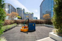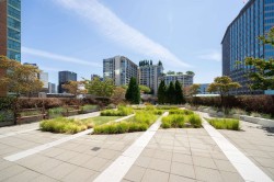 Patina - a luxury high rise in a prime West End/Downtown location. Lush landscaping, urban modernity and heritage all in one, integrated nicely with the renovated state of the art YMCA. The building boasts a grand lobby, gym, clubhouse, landscaped courtyard with lounge area, rooftop garden terrace, bike room, and 24hr concierge service. Facing he quiet tree-lined street this 1 bedroom + den unit offers a/c Italian tiles, in-floor radiant heating in the bathroom, and pure wool carpet in the bedroom. The kitchen features marble counters, soft closing cabinets with integrated high end appliances. Amble in-suite storage space, w/d, easy draw blinds, pleasant view over trees and city. 1 parking.