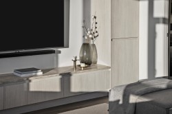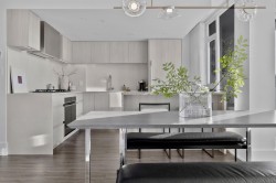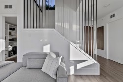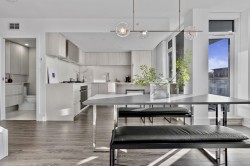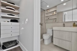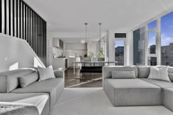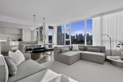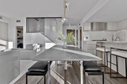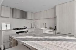Completely redesigned, this Penthouse 2-level home features central AC & heating, full northwest window exposure w/ city views, extensive millwork and stone throughout, as well as custom draperies & auto blinds. The kitchen as integrated fridge & dishwasher, Fisher&Paykel gas cooktop & convection oven, honed quartz countertops with backsplash, and a showpiece travertine stone island. The living room includes a built-in media unit with storage, open display shelving & concealed bar. The den add more additional storage or a home office set up, while there is a huge bonus storage area under the stairs. Upstairs are 2 bedrooms, the primary with custom king bed and walk-in closet, stacked laundry, a built-in work area, and a sprawling terrace with afternoon/evening sun. 1 Parking & 1 Big locker