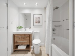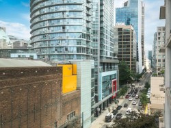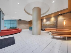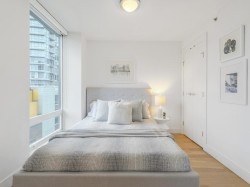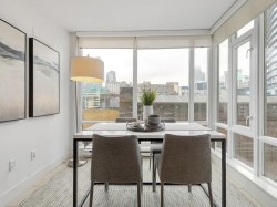 Luxury Georgia award winning well maintained concrete building by Solterra. NW facing with open city views, bright and spacious. Great layout with good sized bedroom. Den is big enough as occasion guest room. Beautiful solarium is great for flex/work space. Modern furnishing, wood cabinets, trendy back splash, gas cooktop, engineered wood floors, stainless steel appliances, in suite laundry. Secured building with concierge in the spacious lobby. Gym, lounge, playground etc. Sought after location, 10/10 walking score. Comes with 1 parking & locker.