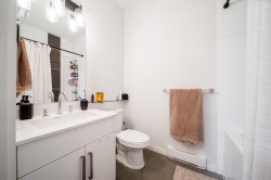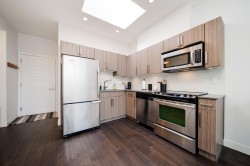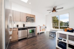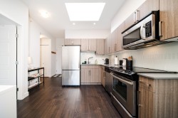 A beautiful penthouse off of Commercial Drive ! This incredibly specious one bedroom top floor unit boasts 9 foot ceilings, views to the North Shore Mountains, a 20 foot patio spanning the entire unit, and a super efficient floor plan (with no wasted space) giving the unit a much larger feel than the square footage would suggest. The open kitchen features stainless appliances, caesar stone counters, plus a skylight that lets the light pour in. In suite storage plus in suite laundry. Located on a treelined traffic controlled street, and only meters to Commercial Drive, transit and the Union-Adanac bike route. This penthouse comes with 1 parking, bike storage is available and pets and rentals are welcome.