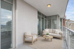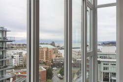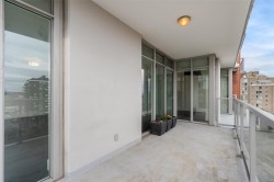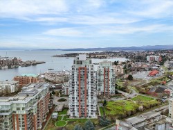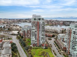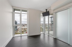 A truly unique floor plan - originally designed as a two-bedroom and thoughtfully reimagined into a spacious one-bedroom (with the option to convert back), this exceptional home is located in Promontory by Bosa. Modern southeast corner suite is flooded with natural light through floor-to-ceiling windows, offering sweeping views from every wall of the ocean, Olympic Mountains, and downtown skyline. The luxury kitchen is equipped with top-of-the-line appliances and overlooks a generous dining area, perfect for both everyday living and entertaining. A custom layout opens the living room to maximize ocean views, complemented by upgraded surround sound. Step outside to an expansive balcony, ideal for year-round enjoyment. Promontory offers concierge service, a fitness centre, social lounge, bike storage, outdoor spaces, and full air conditioning throughout. Surrounded by cafes, shops, restaurants, and entertainment. Just a 10-minute walk to downtown and the Inner Harbour.