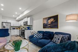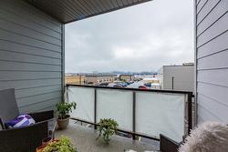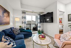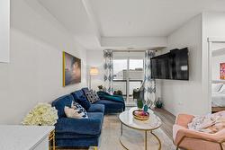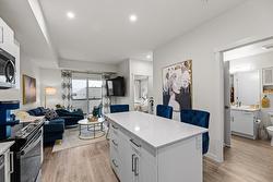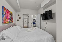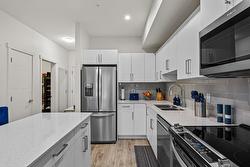 Inside the home, you'll enjoy a bright, open 1 BEDROOM + DEN layout enhanced by 9' ceilings and stylish vinyl plank flooring. The modern kitchen is designed for both beauty and practicality, featuring quartz countertops, flat-panel cabinetry, and stainless-steel appliances. A versatile live/work area offers added flexibility, while the 6' x 10' private deck—with a subtle lake view—creates a nice spot to unwind. You'll also enjoy 1 underground parking stall & storage locker.