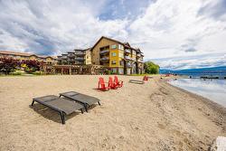 BEST BUY IN BARONA BEACH & PRICED BELOW BC ASSESSMENT $704k! 1 OF ONLY 4 COMPLEXES allowing SHORT-TERM RENTALS in the entire West Kelowna, this gem is not only a dream vacation home but also an enticing investment opportunity ALLOWING airBNB. Positioned on the top floor, you'll enjoy sweeping LAKE and mountain views, while overlooking the pool and marina. This fabulous unit features two bedrooms and a DEN that can easily serve as a third bedroom. LIKE NEW UNIT with newer FLOORING, FRESHLY PAINTED interior and cabinetry, updated light fixtures reflecting a delightful lakeside decor. The spacious kitchen boasts newer appliances and gleaming granite countertops, perfect for entertaining. Step outside to your own slice of paradise with a private sandy beach spanning 600 feet. Enjoy resort-style amenities, including a heated pool, hot tub, full gym, movie theatre, and a rentable party room. For added convenience, there's an on-site beauty salon, a dog run, and community vegetable gardens to grow your own fresh produce! Explore the renowned West Kelowna Wine Trail and vineyards just minutes away, and dining options within a short drive. This condo includes 1 parking stall and a storage unit and can be fully furnished with an additional cost, making it turnkey for short-term rental success. Whether you use it as your own vacation oasis or live at the resort year-round, don't miss out on this rare opportunity to own a piece of the Okanagan lifestyle.