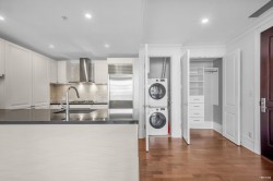 Discover this beautiful & elegant 2 bedroom, 2 bathroom home at Waters Edge. This coveted enclave welcomes you with a sense of luxury and community. Concrete construction, quality & timeless finishings, 10 ft ceilings, air con., chef's kitchen, Miele/Sub Zero app., new W/D, lovely eating area, herringbone h/w flooring, super master with spa like ensuite, custom closets & updates, inc. bathrooms. Great layout with bedrooms on either side. Concierge, impressive lounge, gym, sauna/steam. Exceptionally well maintained building, outdoor landscaping and esthetics to make one proud. Nestled along Capilano River and short stroll to Park Royal, restaurants, seawall, transit, trails & all the conveniences for a carefree lifestyle! Pets welcome. Easy and a pleasure to show.