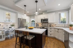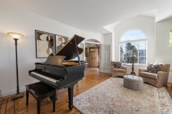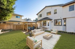 White Rock West Side exec. home 3,634 SF. Ceiling heights on main flr 9 ft. Vaulted formal living rm /dining rm w/ nat gas fp, office w/ balcony south 254 SF. All hardwd flrs on main & above on the bdrm level. Functional open concept family room & ample sized kitchen, plenty of cabinets, island, bevelled-edged corian counters & large eating nook. Fireplace feature wall w/ storage options. Vaulted 17'10" foyer w/ staircase up. 3 generous bdrms above. Primary suite 575 SF. Below: basement 1 bdrm & full bath, rec room & wet bar + storage room. Dual access to garage 466 SF. Backyard is bright fenced & landscaped, gazebo-arbor & patio 446 SF. Schools: Semi. & Bayridge. Walk to beach, parks & rec: tennis, pickleball, playground. Transit & shopping.