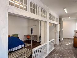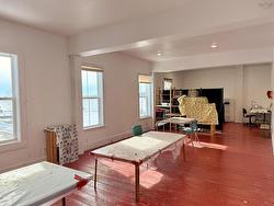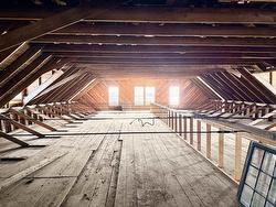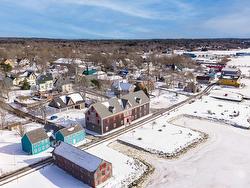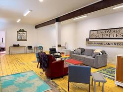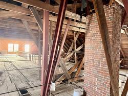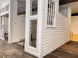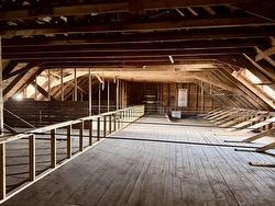 An iconic landmark on the waterfront of Shelburne’s historic district, this large Greek Revival building is set directly on Dock St., facing south and spanning the length of the block from Ann Street to Maiden Lane. Known locally as the Cox Warehouse, it was built for merchant and shipbuilder George A. Cox in 1902 and acquired by the Shelburne Historical Society in 1986. The building, which is a municipally registered heritage property, is 160 ft / 49 m long, has three storeys and sits on a granite block foundation. The structure’s exterior still boasts many of its original architectural features, including return eaves with ornamental brackets, corner boards, decorative moulded panels flanking the south entry and doric columns supporting the front entablature. Many of the original oak beams and pine planks used in the interior construction of the building are still exposed and in pristine condition on the second and third floors of the building. The roof has three gabled dormers on the east side and two on the west side, with a large central dormer over an entrance on the west side. A steeple which was added to the roofline in 1994 for the film production of The Scarlet Letter is still in place and accessible from the third floor. The first floor of the building is leased by Shelburne Physiotherapy, a local business and long-term tenant. The second floor holds a seasonal loft apartment and artefact storage for the Shelburne County Museum. The third floor or attic of the building, which has an extensive steel cable bracing system, is undeveloped.