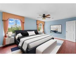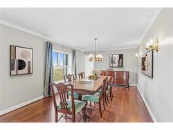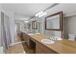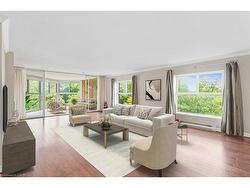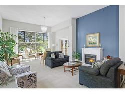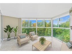 Welcome to The Highlands by the Park; 20 Berkley Road. Nestled atop a hill at the end of a quiet cul-de-sac in historic West Galt, this prestigious condominium offers tranquility, privacy, and sweeping views of nature and the city skyline. Overlooking a majestic woodlot, Victoria Park, and beyond, this building is one of Cambridge's hidden gems. This spacious 2,418 square foot, carpet-free unit offers a rare combination of size, layout, and natural light. With 3 generously sized bedrooms, 2 full bathrooms, and a thoughtfully designed floor plan, it’s ideal for those seeking a blend of comfort and functionality. Step into an impressive foyer with mirrored walls and a large closet before entering the bright eat-in kitchen, complete with ceramic tile, crisp white cabinetry, built-in range top, track lighting and a cozy breakfast nook that looks out over lush greenery. The kitchen opens into a formal dining room with laminate flooring and elegant wall sconces; perfect for entertaining. The adjacent oversized living room features a wood-burning fireplace (sold in as-is condition) and leads to a bright all-season solarium with floor-to-ceiling windows, perfect as a den, office, or creative space. Down the hallway, you’ll find three spacious bedrooms, including a large primary suite with two large windows, an expansive walk-in closet, and a 5-piece ensuite. A second 4-piece guest bath serves the remaining bedrooms. The in-suite laundry closet is conveniently tucked away off the main hallway. Building amenities include a rooftop terrace with panoramic views, ample seating, and barbecue, a party room with full kitchen and lounge area, meeting room, exercise room, and beautifully maintained common spaces. This unit includes one underground parking spot with a tandem storage locker. Don’t miss this rare opportunity to live in a peaceful, elevated community surrounded by nature, just minutes from the charm and culture of West Galt.