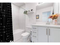 This rare freehold townhome offers nearly 1,300 sq. ft. of thoughtfully designed space in the sought-after Fifty Point / Community Beach area – just a short walk to the lake and seconds to the QEW. Tucked into a friendly neighbourhood and surrounded by parks, trails, and the harbour, it blends convenience with a relaxed, recreational vibe.Inside, you’ll find a bright, open-concept main floor with soaring 9-foot ceilings, a practical layout, and tasteful finishes perfect for both everyday living and entertaining. The kitchen features a functional sit-up island, ample cabinet space, and stainless-steel appliances, opening seamlessly to a spacious dining area and a sun-filled living room. Step through sliding doors to a private balcony with unobstructed views – ideal for morning coffee or evening BBQs.Upstairs features a spacious primary suite with a walk-in closet, a generous second bedroom, a stylish 4-piece bathroom, and laundry – all on the same floor for ease of living. The ground level includes a rare oversized walk-in storage room, plus an inside-entry single car garage with automatic door and additional driveway parking. Low monthly fees cover visitor parking, common elements, and snow removal.