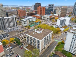 Welcome to Core Lofts - Hamilton's premier loft condominium, ideally situated in the city's coveted Durand neighbourhood. Once a former Bell Canada office building, this landmark conversion seamlessly blends industrial character w/ sophisticated urban design. This exceptional 1143 sq ft, 2-bdrm, 2-bath penthouse offers an elevated living experience w/ western exposure. Polished concrete floors, soaring 12.5' ceil & expansive windows create a striking open-concept environment filled w/ natural light. The custom-reno'd kitch is a true showpiece, feat bespoke cabinetry, quartz counters, a stylish tiled backsplash, S/S app (incl a beverage fridge) & a large centre island w/ dual overhang seating for up to 8. The spacious liv rm opens to a Juliette balcony overlooking the city skyline, while the primary retreat feat an oversized closet, custom oversized wardrobe & a luxe upgraded 3-pc ensuite w/ an oversized glass shower & modern finishes. A 2nd bedroom, currently utilized as a den, provides flexibility for a home office or guest suite. The beautifully updated 4-pc main bath feat a tub/shower combo w/ a glass enclosure. Add highlights incl in-suite laundry, upgraded lighting, a tandem 2-car parking space (#59 PL-2 Lvl A), & an oversized storage locker (#23 on penthouse lvl). Steps away from access to a rooftop terrace w/ panoramic views of the city & topography, complete with BBQ areas & multiple seating zones. Add amenities incl a well-equipped gym, a stylish lobby, & a modern meeting room. Recent notable building improvements incl elevators, HVAC systems, & improved entry security. The location is second to none - steps to vibrant James St, the GO Station for easy commuting to Toronto, restaurants, shops, St. Joseph's Hospital, & the Downtown Arts District. Walk to parks, trails, cafés, & everything downtown has to offer. This rare penthouse combines timeless industrial style, urban convenience, & luxe comfort - truly one of Hamilton's most impressive loft residences.