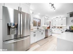 This beautifully updated home sits on a stunning 75 x 202 treed lot, backing onto peaceful greenspace in a sought-after Alcona neighbourhood. A standout feature is the bright, above ground, self-contained 1-bedroom apartment with its own entrance, kitchen, laundry, and hydro; ideal for extra income or in-laws. The main living space offers a BRAND NEW designer kitchen, open-concept living, three spacious bedrooms and a spa-like semi-ensuite bathroom with a custom 2-person shower and corner soaker tub. Also appreciate the basement flex-space completely separate from the apartment, offering an extra 500sqft for your personal use. Enjoy the professionally landscaped yard, Arctic Ocean Legend swim spa with 60 jets, impressive barn with hydro ideal for a workshop, storage, or hobby space, and a generator backup system - providing peace of mind year-round. Located just a short walk to local shops, parks, and Innisfil Beach Park, and with easy access to Hwy 400, this property combines lifestyle and convenience in one perfect package.