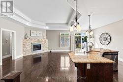 Elegant Living in Central Kingston - 1213 Atkinson Street. Nestled on a beautifully landscaped lot in the coveted Lyndenwood neighbourhood, 1213 Atkinson Street blends timeless curb appeal with custom craftsmanship and thoughtful modern updates. This Haynes-built home is a rare gem designed to impress while delivering everyday comfort. From the all-brick, stone, and stucco exterior to the stunning new stone walkway and lush front gardens, this home makes a striking first impression. Step inside to soaring ceilings, elegant pillars, and rich hardwood floors. A formal dining room with vaulted ceilings serves as an comfortable lounge a perfect space to unwind with guests, enjoy evening cocktails, or curl up with a good book. This room's versatility allows it to easily convert to a formal dining function or continue as a cozy yet upscale entertaining area. The heart of the home is the spacious open-concept kitchen, living, and dining area. Granite countertops, warm custom cabinetry, and a large island invite gathering, while the gas fireplace and coffered ceilings add charm and character. Walk out to the private, fenced backyard where the lilac blooms and the carefully curated landscaping frame the natural gas BBQ area and deck ideal for summer evenings at home. The main level offers a serene primary bedroom with a walk-in closet and convenient ensuite, plus a second bedroom and full bath; these are separated from the living room by a custom pocket door for added privacy. Main-floor laundry adds everyday convenience. Downstairs, the fully finished lower level is its own retreat featuring a massive rec room, two additional bedrooms, a workout area, and another full bathroom, perfect for guests or teens. With approximately 2,500 sq ft of finished living space, recent upgrades include designer lighting and enhanced landscaping in both front and back yards. This home offers upscale comfort in one of Kingston's most central and convenient communities. (id:7525)