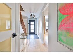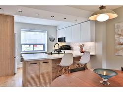 Welcome to this beautifully renovated and thoroughly updated 3-bedroom, 2-bath townhouse set in the heart of the vibrant community of Port Credit. Enjoy stylish finishes and modern appointments in the bright, open-concept main level which offers an inviting layout, highlighted by a stunning custom kitchen (2022) featuring bespoke cabinetry, under-cabinet lighting, quartz countertops, a zellige tile backsplash, island seating, stylish wood accents, and newer appliances including a 2023 fridge and microwave. Fresh paint, LED pot lights, new maple hardwood flooring, porcelain tile in the entry, and all-new doors and trim create a seamless modern feel. The spacious living area opens to a private rear garden, perfect for relaxing or entertaining, and is complemented by an adjoining dining area. A new exterior entry door adds a fresh, contemporary touch to the home’s façade.Upstairs, the home offers three generous bedrooms with hardwood flooring throughout and ample closet space. The fully renovated (2019) 4-piece main bath exudes elegance with marble tile flooring, pot lights, porcelain wall tile, a quartz-topped vanity, and a Toto toilet.The fully renovated (2025) lower level provides exceptional versatility with a spacious rec room ideal as an additional living area or potential bedroom. This level showcases vinyl plank stairs and flooring, new trim and baseboards, LED pot lights, and fresh paint. Completing the space is a beautifully renovated (2019) 3-piece bath offering an oversized glass framed shower, basketweave tile flooring, pot lights, custom vanity, and a Toto toilet. The utility room features a newer furnace & A/C (2021), laundry area, ample storage and convenient separate entrance from the garage.Just minutes from Port Credit village, the GO Train, major highways, top-rated schools, parks, Lake Ontario, and the waterfront trail, this home perfectly blends modern luxury with everyday convenience. Don’t miss this exceptional opportunity.