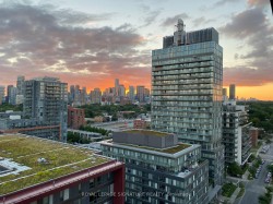 Bright 1+den with two bathrooms, parking, and unobstructed west-facing skyline views.Welcome to Suite 1405 at Paintbox Condos - a well-designed home with 9-foot ceilings and a functional open-concept layout.The living and dining area is filled with natural light and walks out to an oversized balcony - ideal for morning coffee or sunset views across the skyline. The modern kitchen features full-sized stainless steel appliances, generous counter space, ample storage, and a new dishwasher. The spacious primary bedroom offers a private 4-piece ensuite, complemented by a second 3-piece bath for guests or shared living. A large den provides flexibility for a dedicated home office, nursery, or additional living space.Includes 1 parking space, 1 locker, and ensuite laundry. Amenities feature a gym, party room, guest suite, BBQ terrace, theatre room, games room, and lounge.Steps to TTC and minutes to Eaton Centre, Riverdale Park, and the Distillery District, with quick access to the DVP and Gardiner. Move-in ready, functional, filled with natural light and a spectacular view - a space that truly feels like home.
