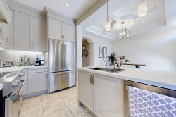 This stunning builders model townhome is a spacious corner unit with a 2-car garage, offering a stylish and functional design with custom upgrades throughout. Located just steps from parks, shopping, the GO Station, Vaughans hospital, a community centre, and a library, this home provides both convenience and modern elegance. Step inside to discover a bright, open-concept family room, with wall-to-wall windows and featuring a custom fireplace accent wall. The elegant dining area is enhanced with coffered ceilings, while the gourmet kitchen boasts quartz countertops, stainless steel appliances, a chic backsplash, a breakfast bar, an eat-in area, and a walkout to a private balcony. With three bedrooms and four upgraded bathrooms, this home is designed for comfort and style. The formal living room offers versatility and can easily function as aguest suite on the ground level or additional entertainment space. Hardwood floors span three levels, complemented by 9-ft ceilings on the main floor, crown mouldings, pot lights, smooth ceilings, and designer lighting. Thoughtful custom-built closet organizers, window coverings, and stylish built-ins add both elegance and practicality. The fully finished basement extends the living space with an open-concept recreation room and a spa-like 3-piece bathroom.