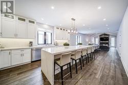 Step into this exceptional detached raised bungalow, where modern luxury meets effortless everyday living. Offering over 3,300 sq. ft. of beautifully finished space, this home is crafted to impress from top to bottom. The main floor features three generously sized bedrooms and two spa-inspired 3-piece bathrooms, each adorned with elegant porcelain tile. The heart of the home is the open-concept kitchen and dining area, showcasing custom quartz countertops, a striking waterfall island, and premium stainless steel appliances-perfect for both cooking and entertaining. Bright and inviting, the living room is enhanced by a soaring cathedral ceiling and opens onto a large covered composite deck with modern glass railings, creating an ideal indoor-outdoor retreat. A thoughtfully designed main-floor laundry room with a built-in pantry adds convenience without compromising style. The fully finished lower level provides outstanding extra living space, complete with three spacious bedrooms with above-grade windows, a chic 3-piece bathroom, and a large kitchenette featuring custom quartz counters. The expansive dining and family area is perfect for hosting gatherings or creating a private suite for extended family. Move-in ready and loaded with high-end finishes and carefully selected upgrades, this home is a rare find that truly must be seen to be appreciated. (id:7525)